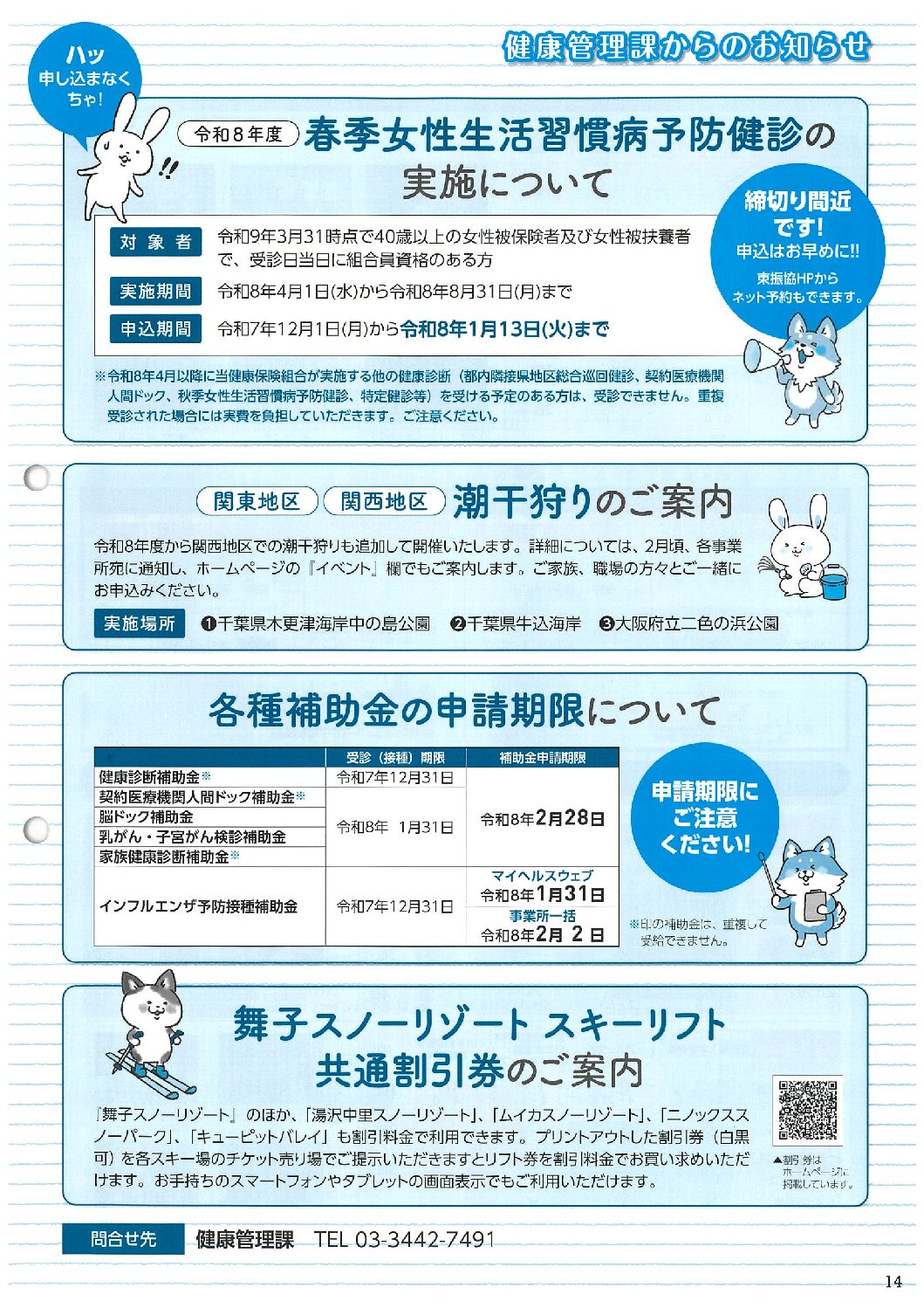 健康管理課からのお知らせ 「春季女性生活習慣病予防健診の実施について」・「潮干狩りのご案内」・「各種補助金の申請期限について」・「舞子スノーリゾート スキーリフト 共通割引券のご案内」 2026年2月6日 カテゴリ: 健保 顧客名称: 自動車振興会健康保険組合 編集担当: 藤井 タグ:けんぽだより2026冬号 共通割引券 女性生活習慣病予防健診 潮干狩り 補助金の申請期限 ← 過去の投稿へ 次の投稿へ →