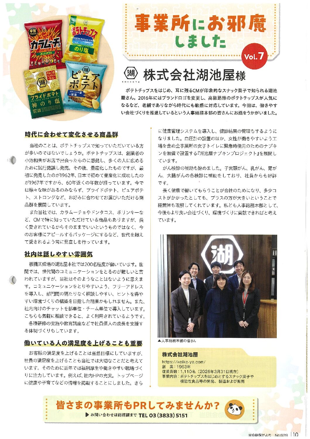 【事業所にお邪魔しました vol.7】株式会社 湖池屋 様 2026年2月10日 カテゴリ: 健保 顧客名称: 東京都食品健康保険組合 編集担当: 谷中 タグ:けんぽだより2026冬号 事業所訪問 ← 過去の投稿へ 次の投稿へ →