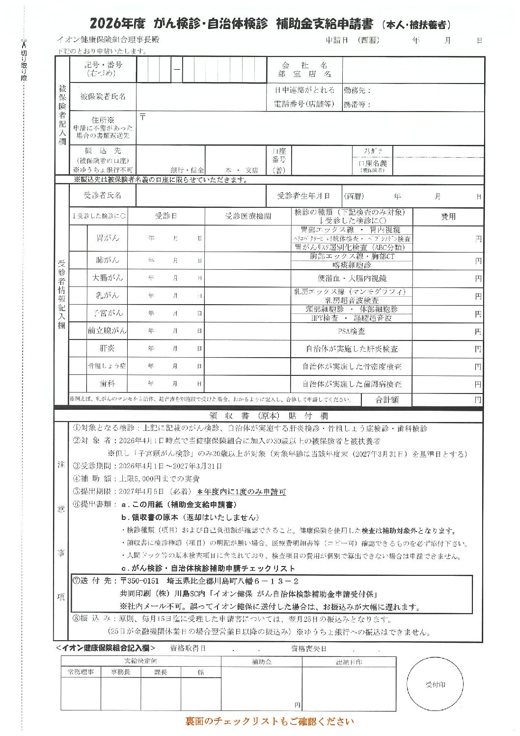 がん検診・自治体検診補助申請チェックリスト けんぽだより2026春号 補助金支給申請書