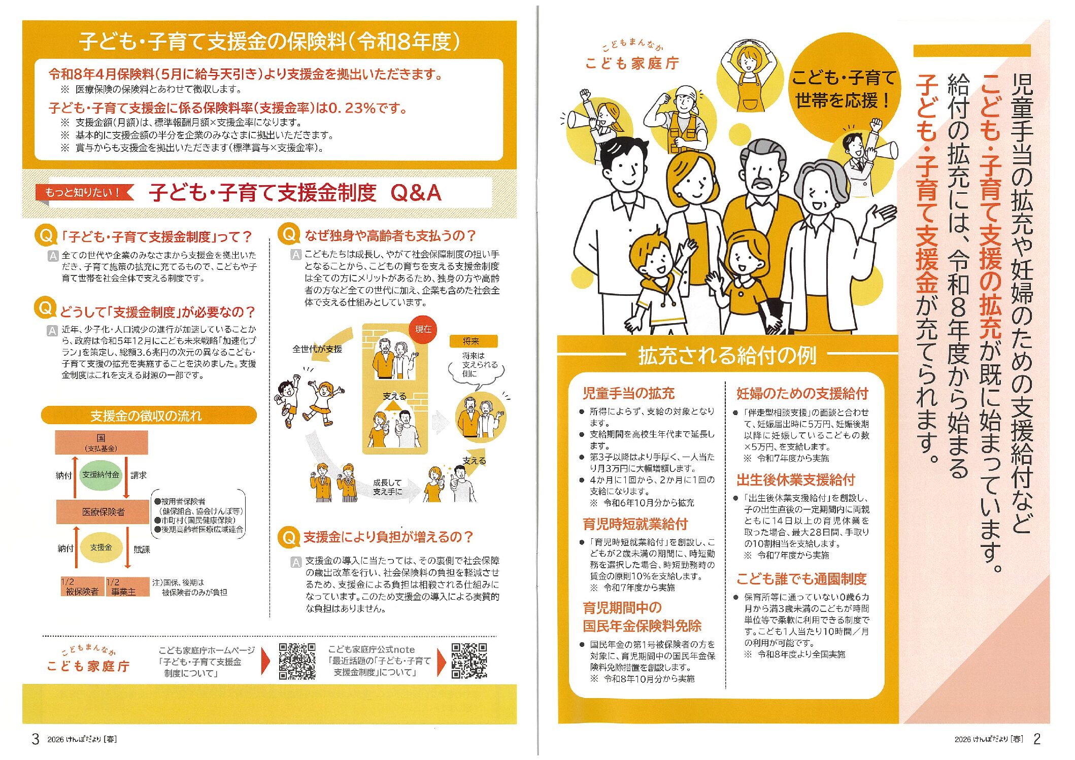 子ども・子育て支援の拡充が始まっています。子ども・子育て支援金制度 2026年4月3日 カテゴリ: 健保 顧客名称: 神奈川県食品製造健康保険組合 編集担当: 宮内 タグ:けんぽだより2026春号 子ども・子育て支援金 給付の拡充 ← 過去の投稿へ 次の投稿へ →