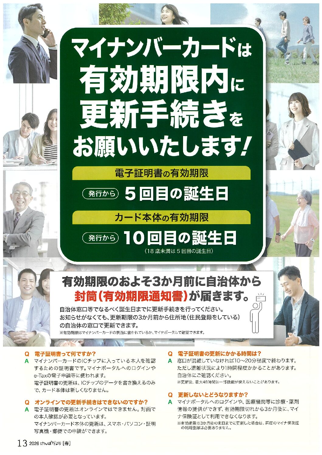 マイナンバーカードは有効期限内に更新手続きをお願いいたします! 2026年4月3日 カテゴリ: 健保 顧客名称: 神奈川県食品製造健康保険組合 編集担当: 宮内 タグ:けんぽだより2026春号 マイナンバーカード マイナンバーカードの更新手続き ← 過去の投稿へ 次の投稿へ →