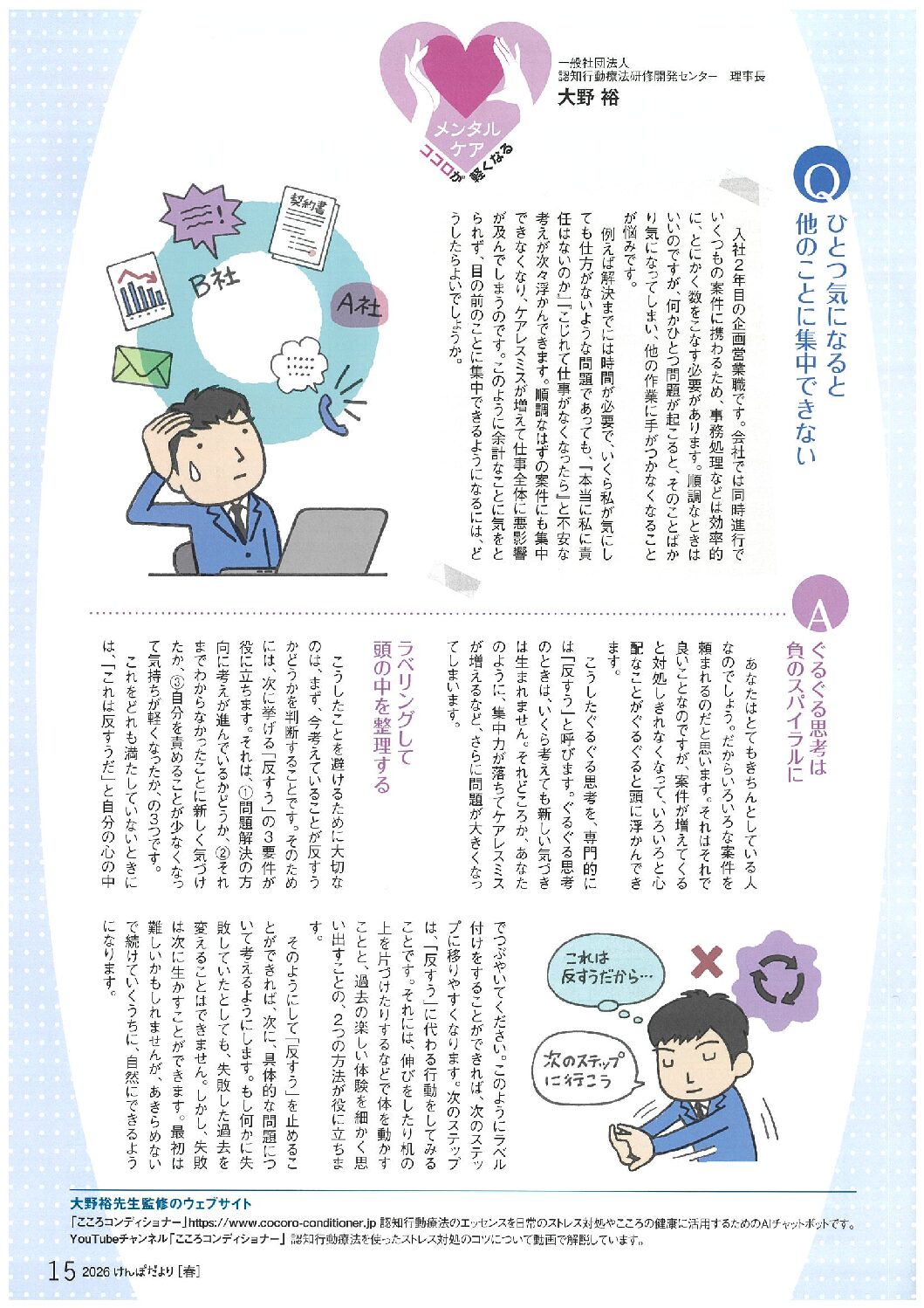 【ココロが軽くなるメンタルケア】ひとつ気になると他のことに集中できない 2026年4月3日 カテゴリ: 健保 顧客名称: 神奈川県食品製造健康保険組合 編集担当: 宮内 タグ:けんぽだより2026春号 こころの健康 ココロが軽くなるメンタルケア メンタルヘルス ← 過去の投稿へ 次の投稿へ →