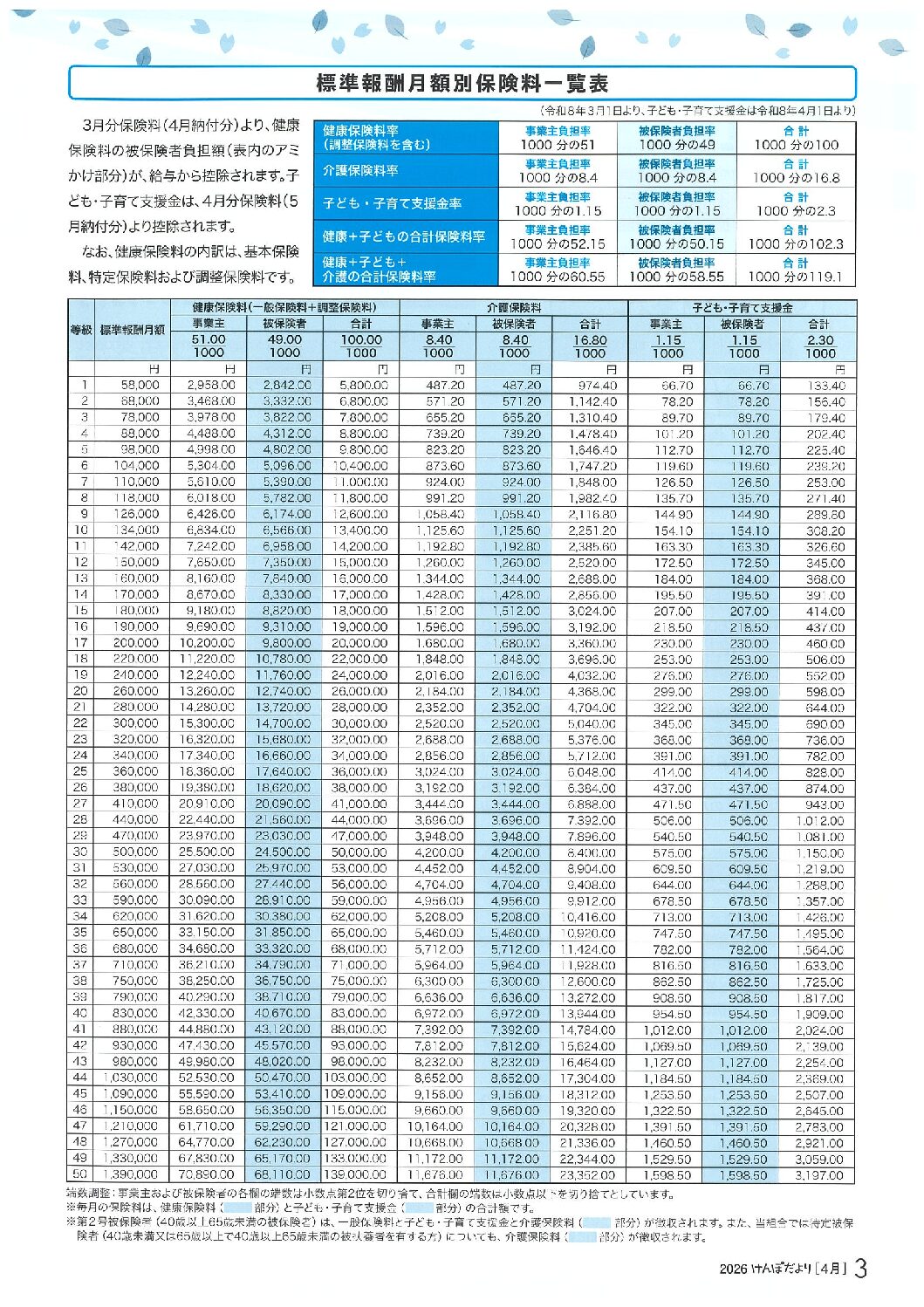標準報酬月額別保険料一覧表 2026年4月3日 カテゴリ: 健保 顧客名称: 東日本電線工業健康保険組合 編集担当: 橋本 タグ:けんぽだより2026春号 標準報酬月額別保険料一覧表 ← 過去の投稿へ 次の投稿へ →