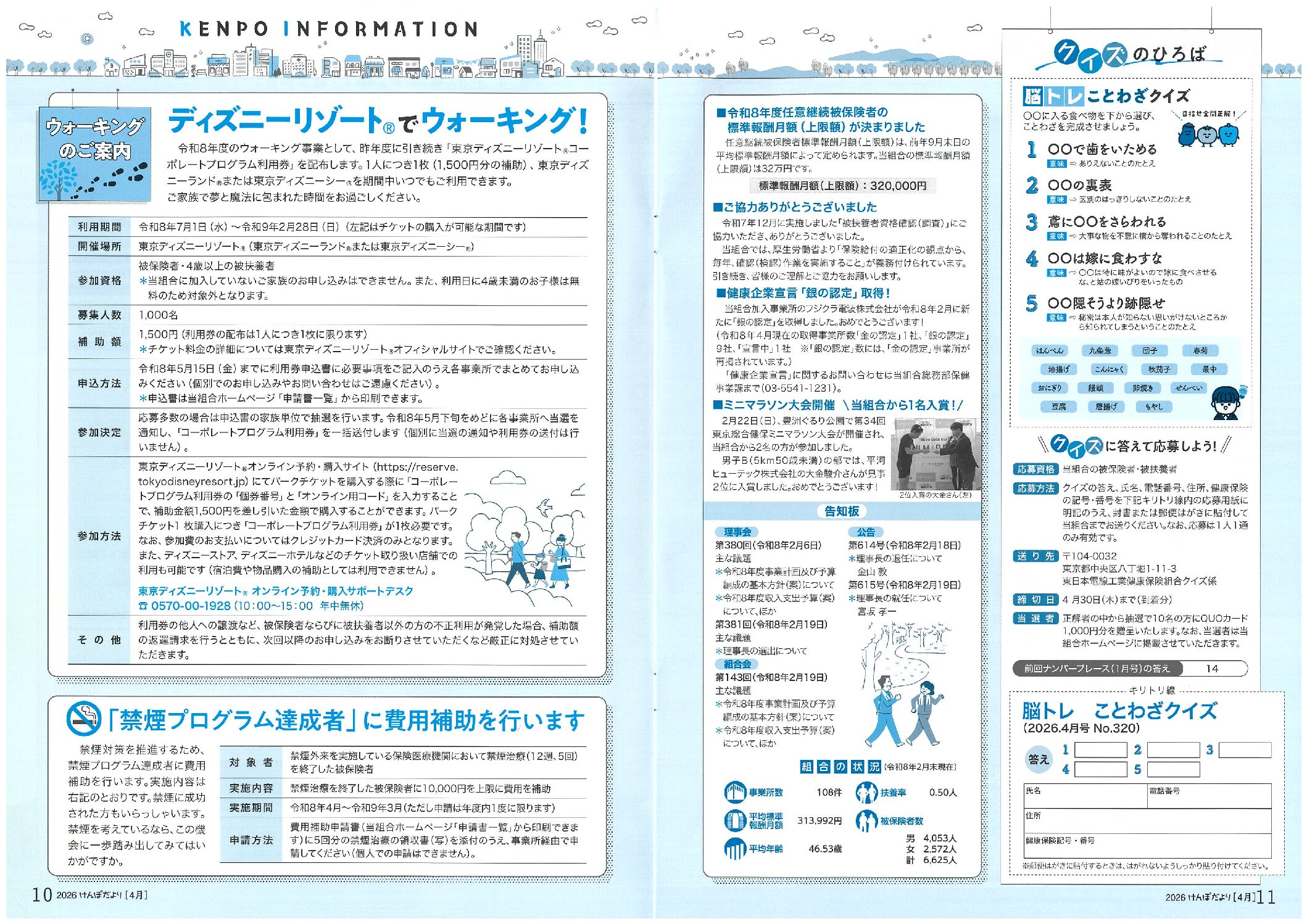 ディズニーランドでウォーキング・「禁煙プログラム達成者」に費用補助・クイズのひろば 2026年4月3日 カテゴリ: 健保 顧客名称: 東日本電線工業健康保険組合 編集担当: 橋本 タグ:けんぽだより2026春号 ウォーキング クイズ 禁煙 脳トレ ← 過去の投稿へ 次の投稿へ →