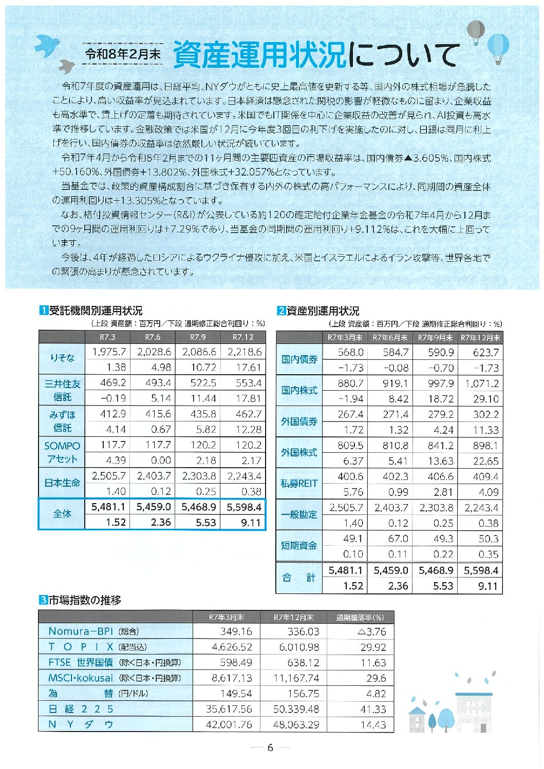 令和8年2月末 資産運用状況について 2026年4月8日 カテゴリ: 年金 顧客名称: 全国情報通信企業年金基金 編集担当: 小林 タグ:基金だより2026春号 資産運用状況 ← 過去の投稿へ 次の投稿へ →