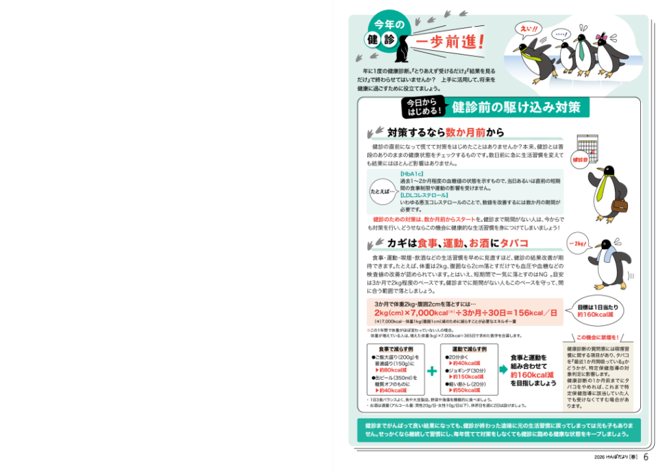 【汎用版】今年の健診一歩前進!:健診前の駆け込み対策 2026年3月1日 カテゴリ: 健保 タグ:○○けんぽだより けんぽだより2026春号 今年の健診一歩前進! 健診 特定健診 生活習慣病 ← 過去の投稿へ 次の投稿へ →