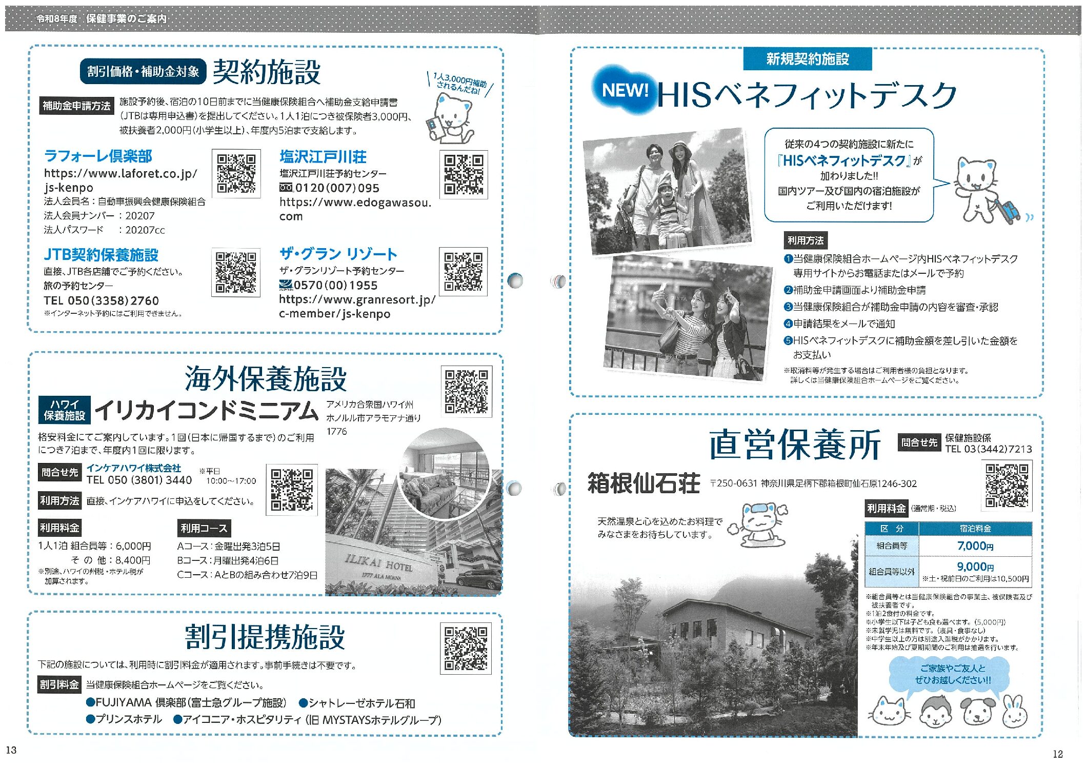 新規契約施設 NEW!HISベネフィットデスク・直営保養所・割引価格 補助金対象 契約施設・海外保養施設・割引提携施設 2026年4月17日 カテゴリ: 健保 顧客名称: 自動車振興会健康保険組合 編集担当: 藤井 タグ:けんぽだより2026春号 契約施設 直営保養所 ← 過去の投稿へ 次の投稿へ →