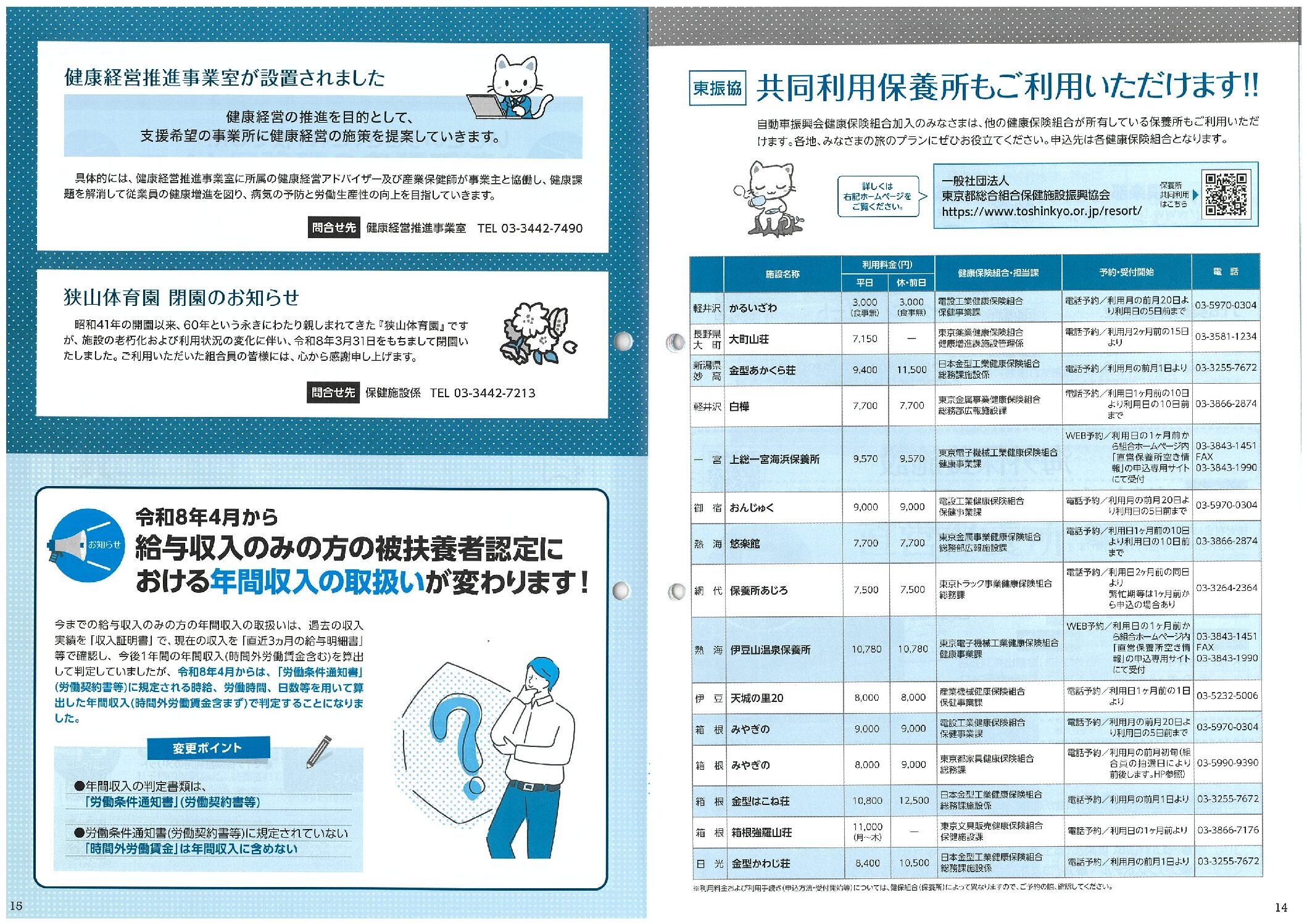 [東振協]共同利用保養所もご利用いただけます!!・健康経営推進事業室が設置されました・閉園のお知らせ・年金収入の取り扱いが変わります! 2026年4月17日 カテゴリ: 健保 顧客名称: 自動車振興会健康保険組合 編集担当: 藤井 タグ:お知らせ けんぽだより2026春号 保養所 健康経営 労働条件通知書 年間収入の取り扱い 時間外労働賃金 被扶養者認定 ← 過去の投稿へ 次の投稿へ →