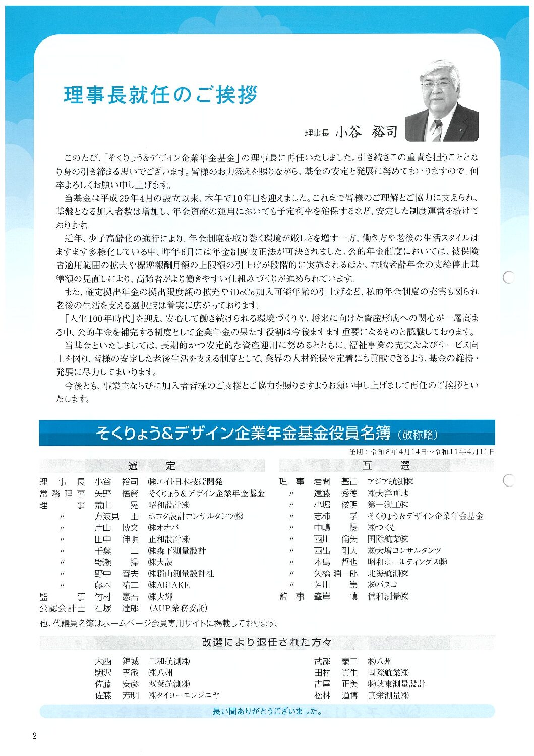 理事長就任のご挨拶・そくりょう&デザイン企業年金基金役員名簿(敬称略)