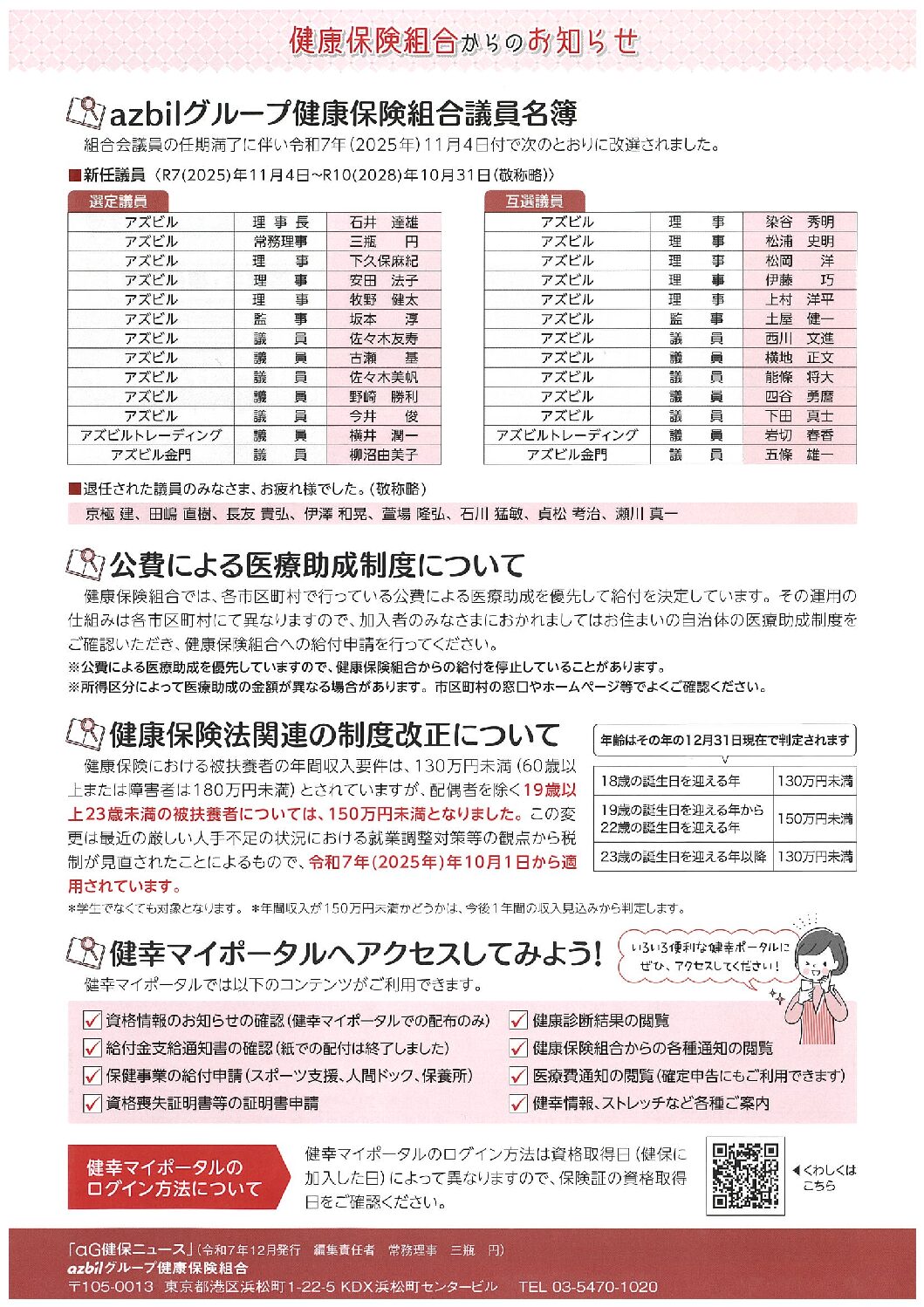 健康保険組合からのお知らせ 2025年12月23日 カテゴリ: 健保 顧客名称: azbil健康保険組合 タグ:aG健保ニュース決算号 azbil健康保険組合 健幸マイポータル 健康保険法関連の制度改正について 公費による医療助成制度について 議員名簿 ← 過去の投稿へ 次の投稿へ →
