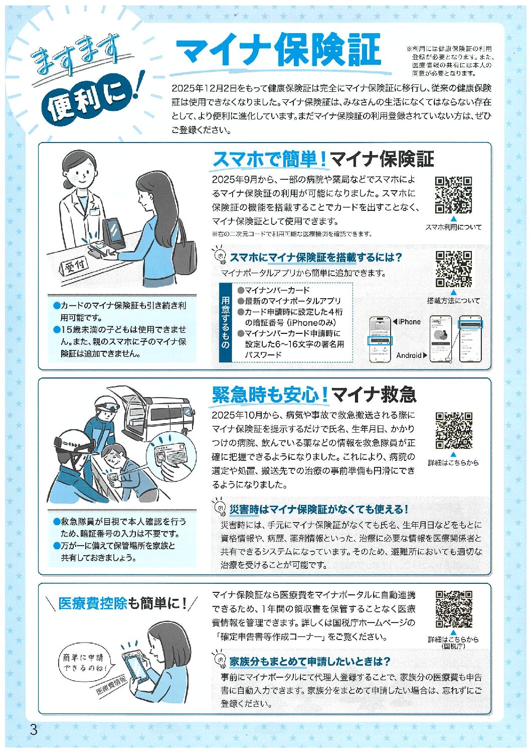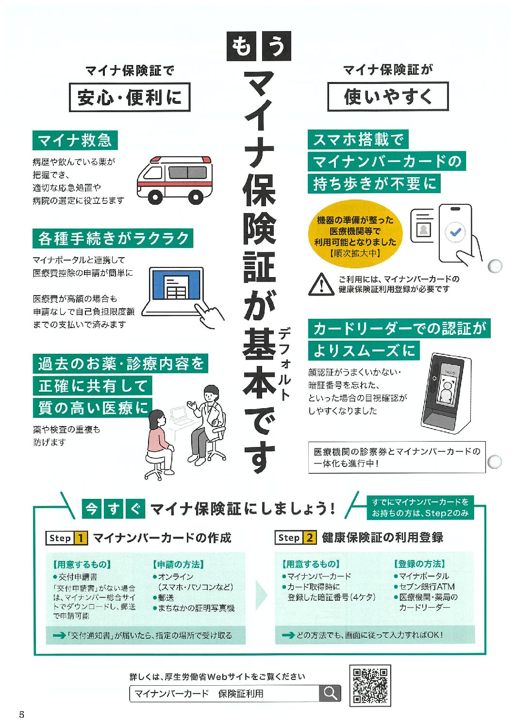 「医療機関はマイナ保険証で受診しましょう!」・「マイナ保険証の有効期限切れにご注意ください」・「マイナ保険証移行後、健康保険の記号・番号はここで確認!」