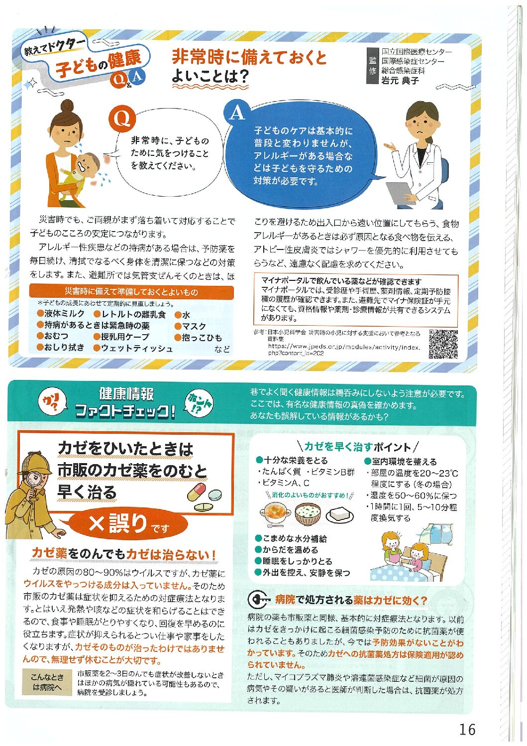 「教えてドクター 子どもの健康Q&A 非常時に備えておくとよいことは?」・「健康情報ファクトチェック!」