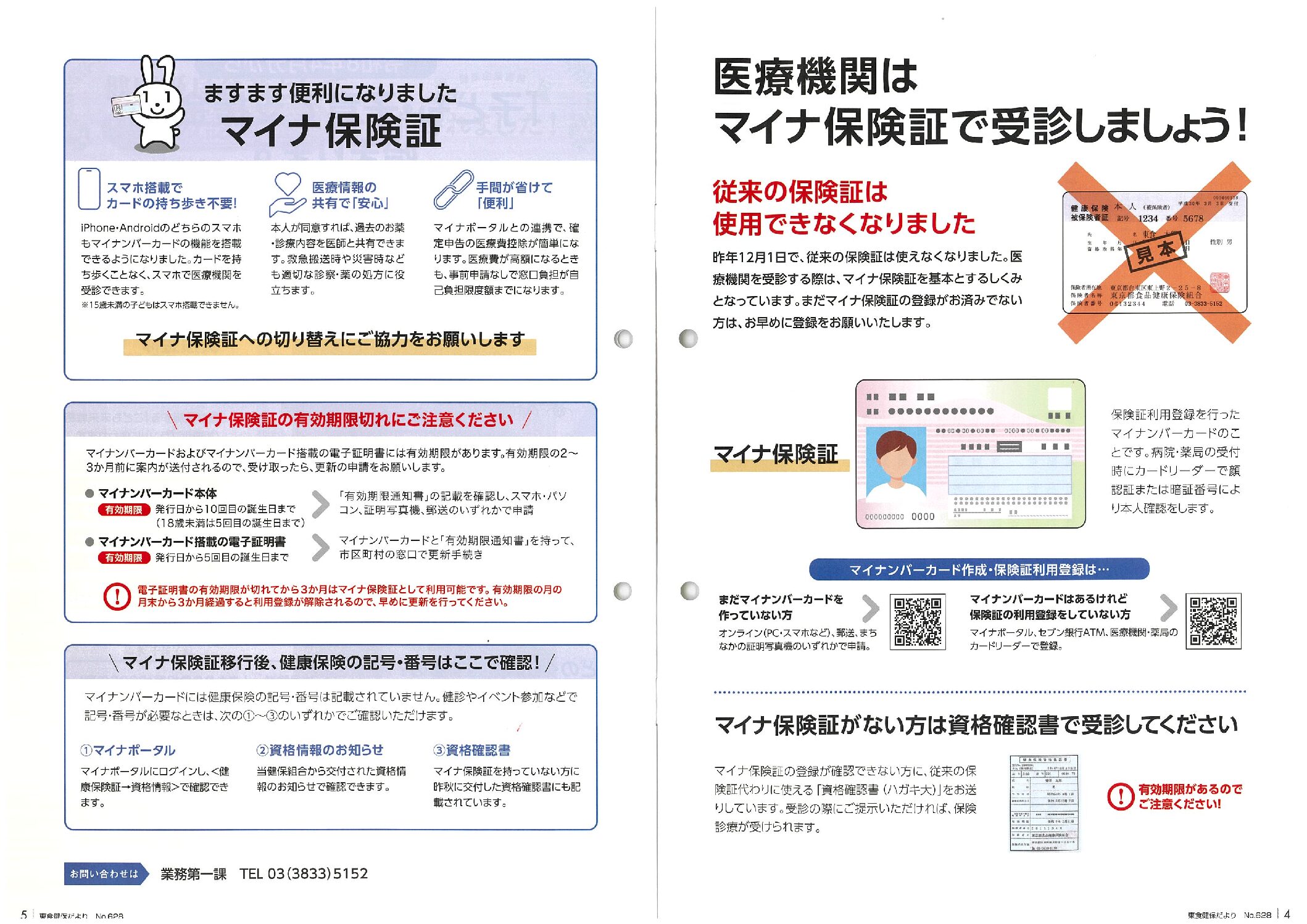 「医療機関はマイナ保険証で受診しましょう!」・「マイナ保険証の有効期限切れにご注意ください」・「マイナ保険証移行後、健康保険の記号・番号はここで確認!」